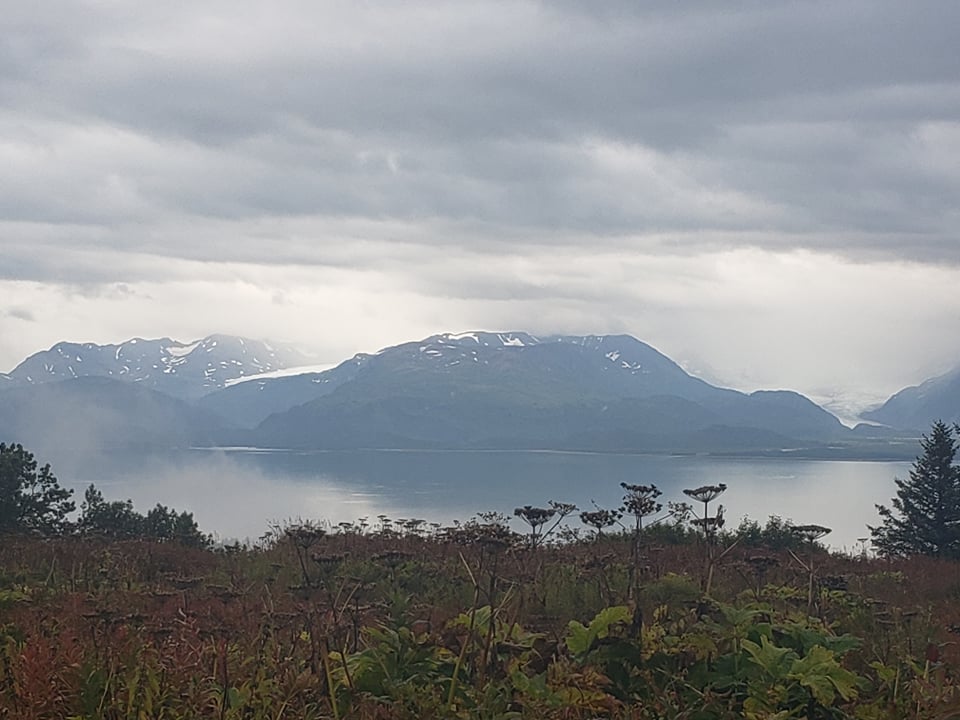 Remember that hill my brother asked if I thought he could make it up? Well it looked a little more daunting on the way back. The dirt that had seemed compact on the way down was loose and thick, sticking to the tires like the Carolina clay does to a boot. My brother shoots up the hill with nervous trepidation as Jeff and I casually encourage him. When I felt the tires spin and the car stop I thought, “Wow, we made it seventy yards”. Luckily we were just past the first switchback where there was enough space to pull off to the side. My brother, obviously flustered by the situation, hopped out and asked Jeff if he would drive. Jeff is a motocross and off road enthusiast who has driven in many different terrains. With him behind the wheel I feel confident we would make it to the top. As he sets off I give encouragement as we pass the second switch back and head up what looks to be the steepest part of the climb. Then…. We stop. The car just wont go any further no matter how many attempts. Jeff decides he wants to try from the bottom and see if he can carry the momentum up past the point he keeps getting thwarted. When we get to the bottom I inform him I’m going to get out and read. If he makes it up he can send my brother down and I’ll walk back up with him. I’ve got a nice spot picked out; the tide is coming in, I can hear the splash of jumping fish, and the two glaciers across the bay shimmer with aquatic color while the salty air fills my senses with lively joy. I stare for a moment, giving thanks for being able to experience such a beautiful sight and then jump into my book. A little while later a young gentleman on a four wheeler pulls up beside me and says, “you Alan”. I reply “indeed” and he informs me the other members of my party have made it to the top. Thankful they made it and dind’t have to get a tow, I start my walk up the steep mile long road. When I reach the top Jeff and Andrew inform me they made it out by driving the car in reverse. A couple locals had suggested it. And although Jeff and my brother were apprehensive at first they gave it a shot. Turns out the advice was solid. Once back on a more firm road we proceed towards the fishing hole. Before we even arrive I indicate my intention to read and enjoy the scenery while they both fish. I find no contestation and feel happy that things are swell. No pun intended. They spend the rest of he evening fishing as I enjoy my book and the scenery. I watch a sea otter nonchalantly swim on his back, then belly, then back to his back only to dive under and pop up twenty feet away. This amused me for a good amount of time. Then with the sun setting in the distance we called it a day.